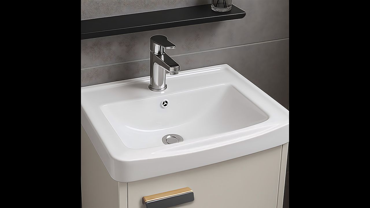 Im Set enthalten ist ein Keramikwaschbecken mit Hahnloch, perfekt auf den Unterschrank abgestimmt. Die neutrale Form bietet Komfort und eine ästhetische Abstimmung mit den übrigen Elementen.
