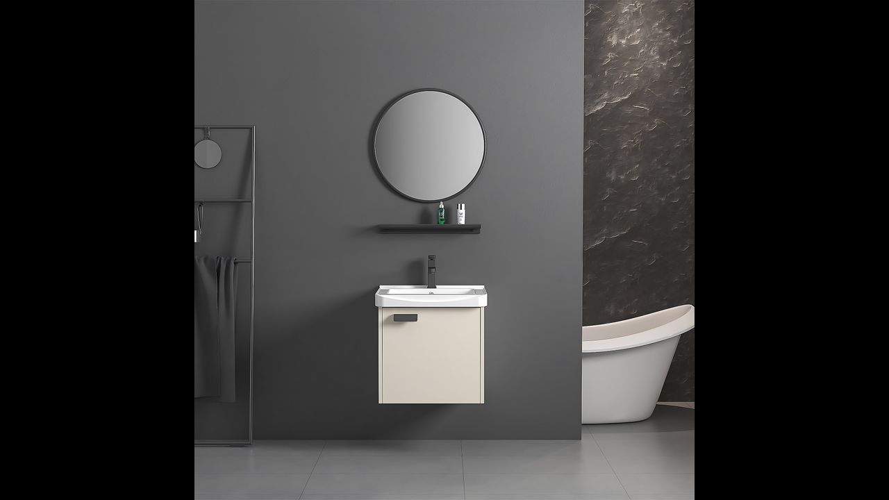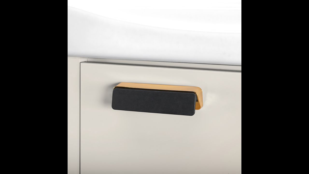 Beige Farbe – erleichtert die Anpassung des Sets an verschiedene Einrichtungsstile: von modern bis klassischer. Abgerundet wird das Ganze durch einen kontrastierenden Griff und einen runden Spiegel, der dem Raum optische Leichtigkeit verleiht.