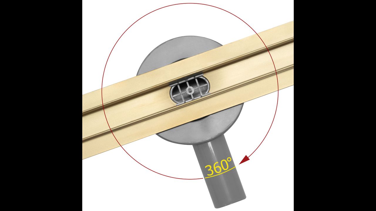 Der Siphon des Pure Neo Pro Abflusses ist drehbar (360-Grad-Bereich), so dass wir ihn an den Abflussrohren an einer nicht standardmäßigen Stelle anbringen können. Das Gitter des Rea Neo Slim Gold Pro Drain ist einseitig und hochglänzend.